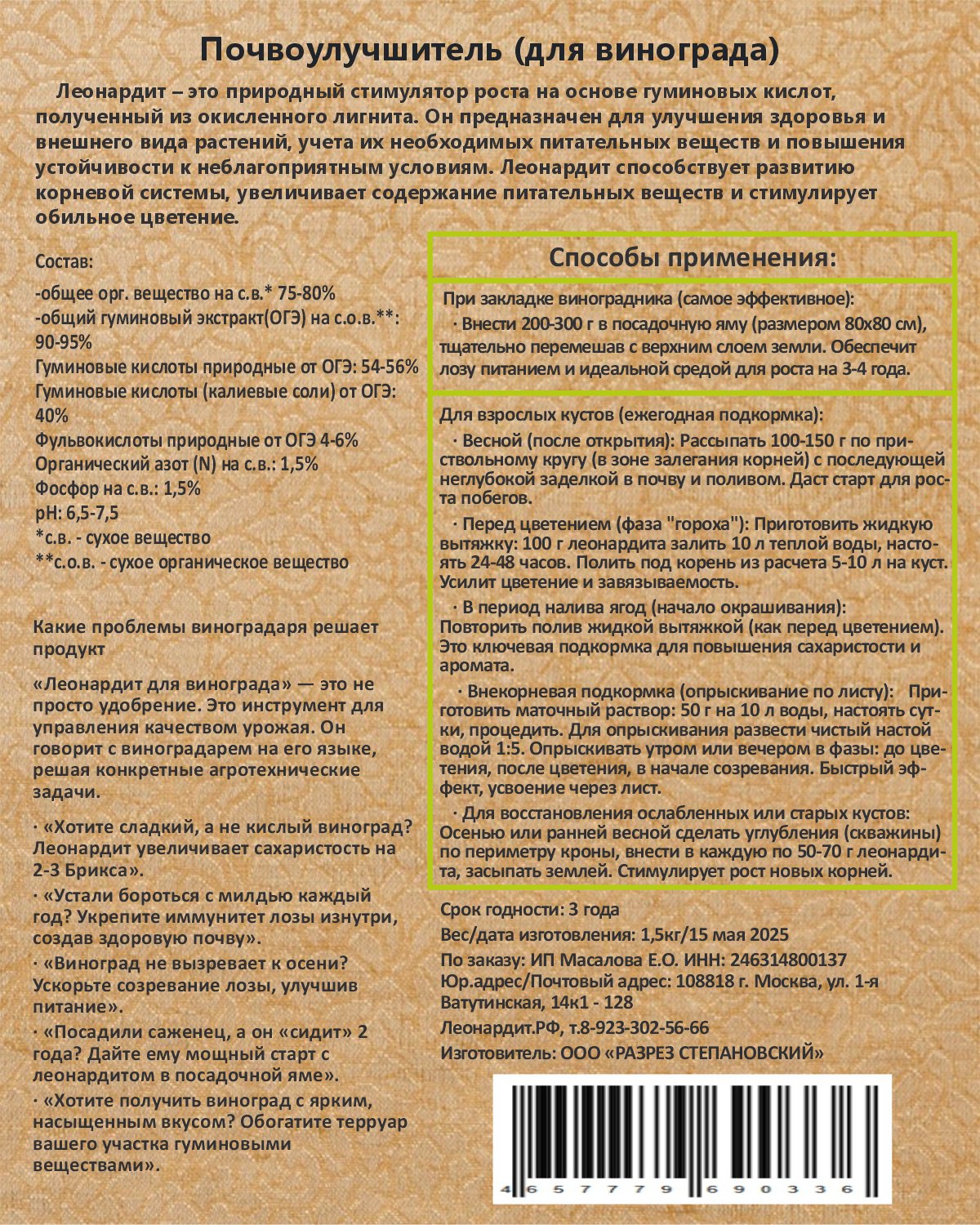 Леонардит в органическом земледелии — это фундаментальный инструмент для создания живой, здоровой и плодородной почвы. Он не заменяет удобрения (компост, навоз), но делает их действие в разы эффективнее. Начиная с улучшения структуры почвы и заканчивая стимуляцией иммунитета растений, леонардит работает как универсальный и абсолютно натуральный "эликсир жизни" для вашего огорода или сада.